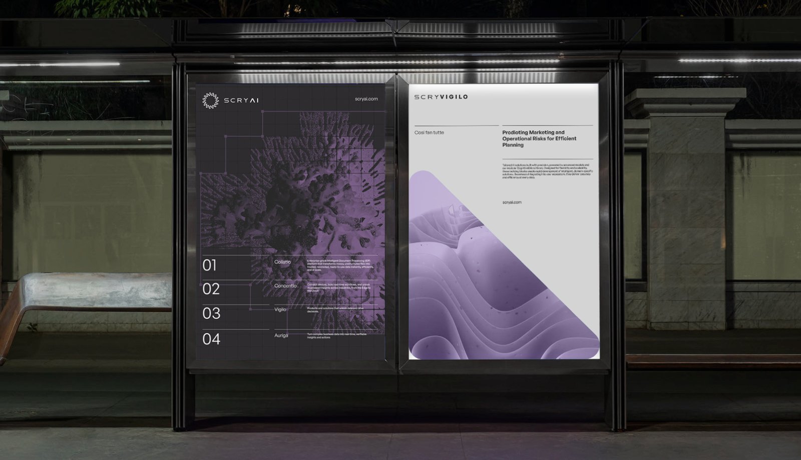Conceptually, we drew from the idea of “scrying” and the metaphor of a crystal ball—using refractions of light as a way to depict multiple perspectives, varied data inputs and possible futures converging into one sharp insight. This allowed the brand to feel layered and sophisticated, yet clean and contemporary. Structurally, the system was designed to work across ScryAI’s suite of platforms and solutions, creating a unified yet flexible brand architecture.